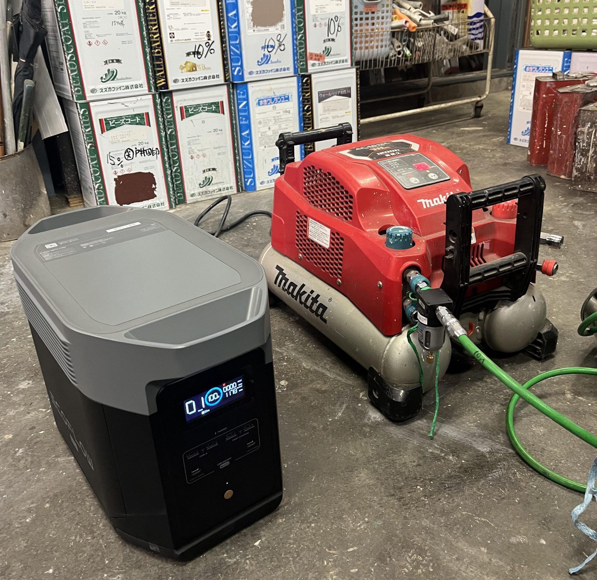 弊社は、建築塗装や吹き付け、修繕工事などを行っている専門工事業者です。主にコンプレッサーなどの電動工具を用いて作業を行いますが、電源のない場所やマンションの共益部などで使用できるブレーカーのアンペア数が足りず、コンプレッサーが使用できない現場がありました。それによって作業が中断されることも多く、頭を悩ませていました。そこで、それをカバーする良い方法がないかと考えていたときに、インターネットでEcoFlowの製品を知りました。そのあと、2023年4月に行われた塗装業界最大の総合展示会で、EcoFlow DELTA 2のデモ機を見て、手に取って実際に使ったのが決め手となり購入に至りました。 実は、ビジネスを始めた10年以上前からこうした課題を認識していましたが、当時はまだポータブル電源が仕事で使用できるか不明でした。ガソリン発電機を使用していましたが、音や排ガスにより使用を控えなければいけない現場もあり作業効率がよくありませんでした。今の時代は可搬式の大容量バッテリーが入手できて非常に便利になりました。